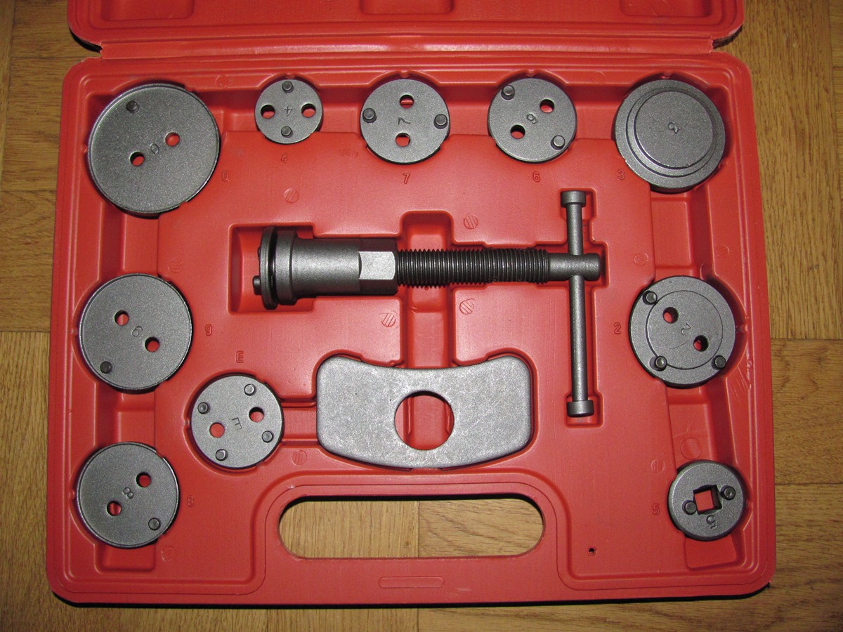 На всякий случай перед началом ремонта купил набор для утапливания поршней тормозного цилиндра. Можно справиться и без него, например, при помощи велосипедного ключа с выемками или круглогубцев, но зачем, если есть набор?..