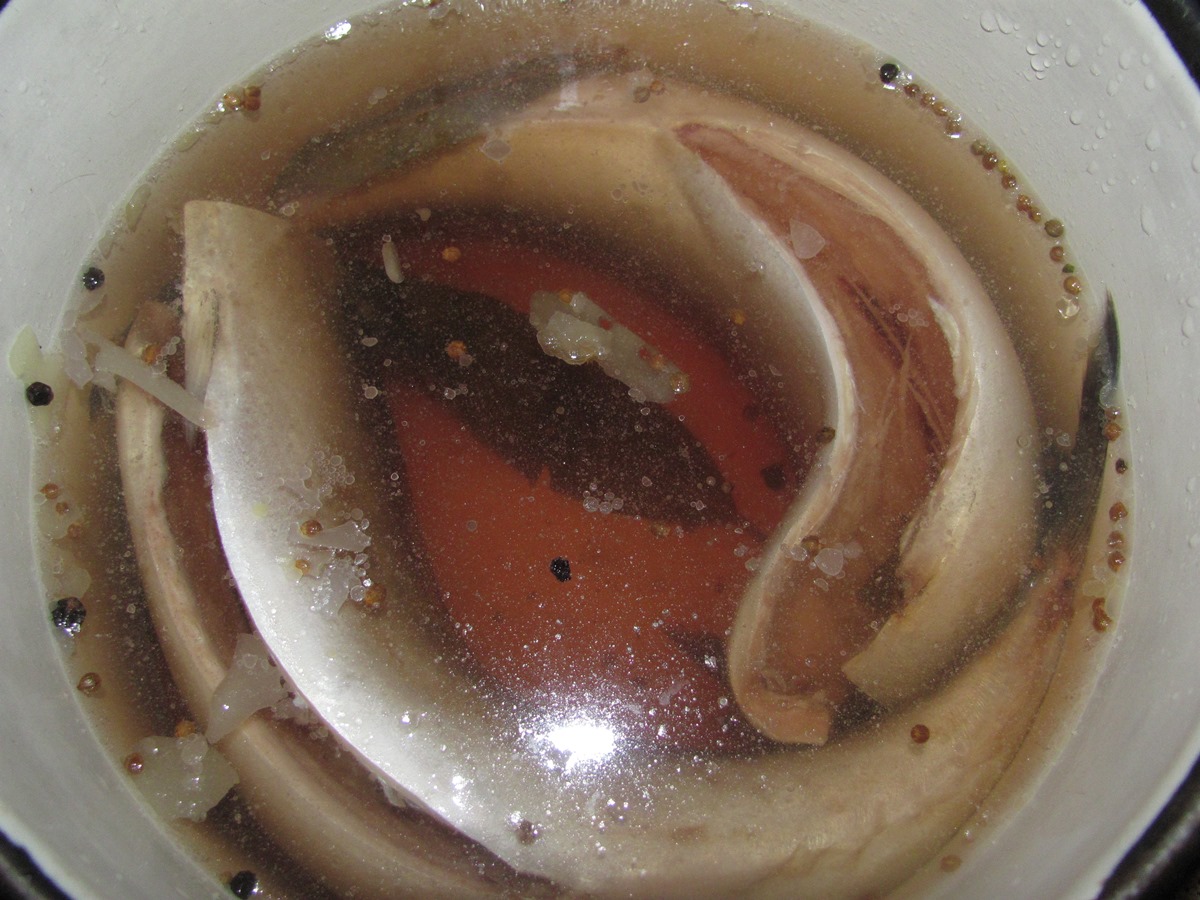 Далее приготавливаем рассол. Для этого кипятим воду. На 1 литр воды добавляем 1,5 столовых ложки соли, 3 столовых ложки сахара, 10 горошков черного перца, пол чайной ложки горошков кориандра, 3 лавровых листа. Размешиваем и даем рассолу остыть.