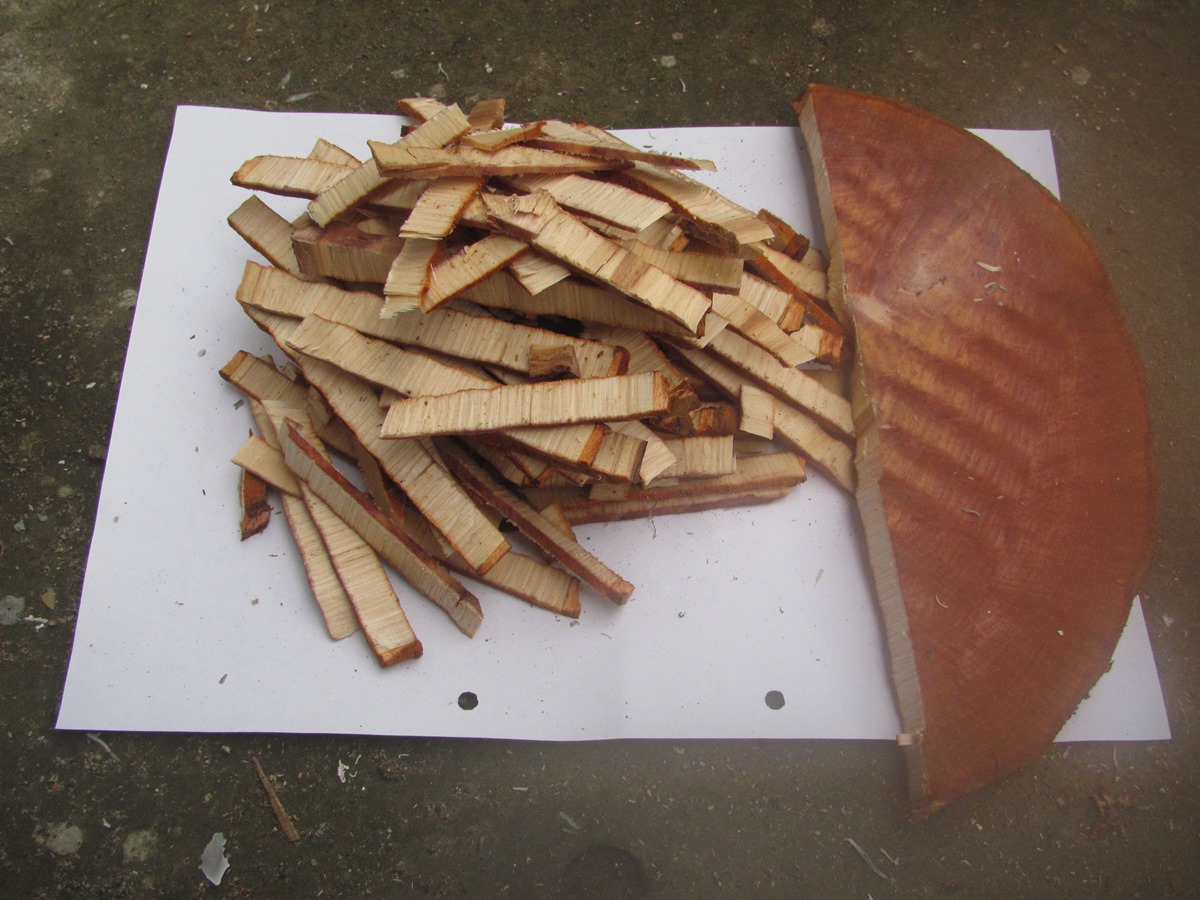 Теперь снимаем кору и режем пластину на щепу, после чего ломаем ее на части длиной около 2 см. Ольха была влажной, но если сухая – щепу нужно предварительно замочить в воде.