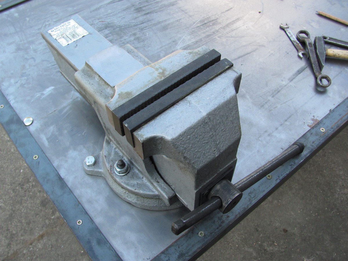 Крепим столешницу к основанию. Вроде бы и все. Ан нет! Забыли самое важное – добротные слесарные тиски. О тисках можно говорить долго, выбрать тиски нелегко. После длительных поисков остановился на отечественных тисках со знаменитым советским прошлым производства Барановичского завода станкопринадлежностей, модель Т-160У (ширина губок 160 мм). Хорошим тискам – хорошие болты производства Речицкого метизного завода.
