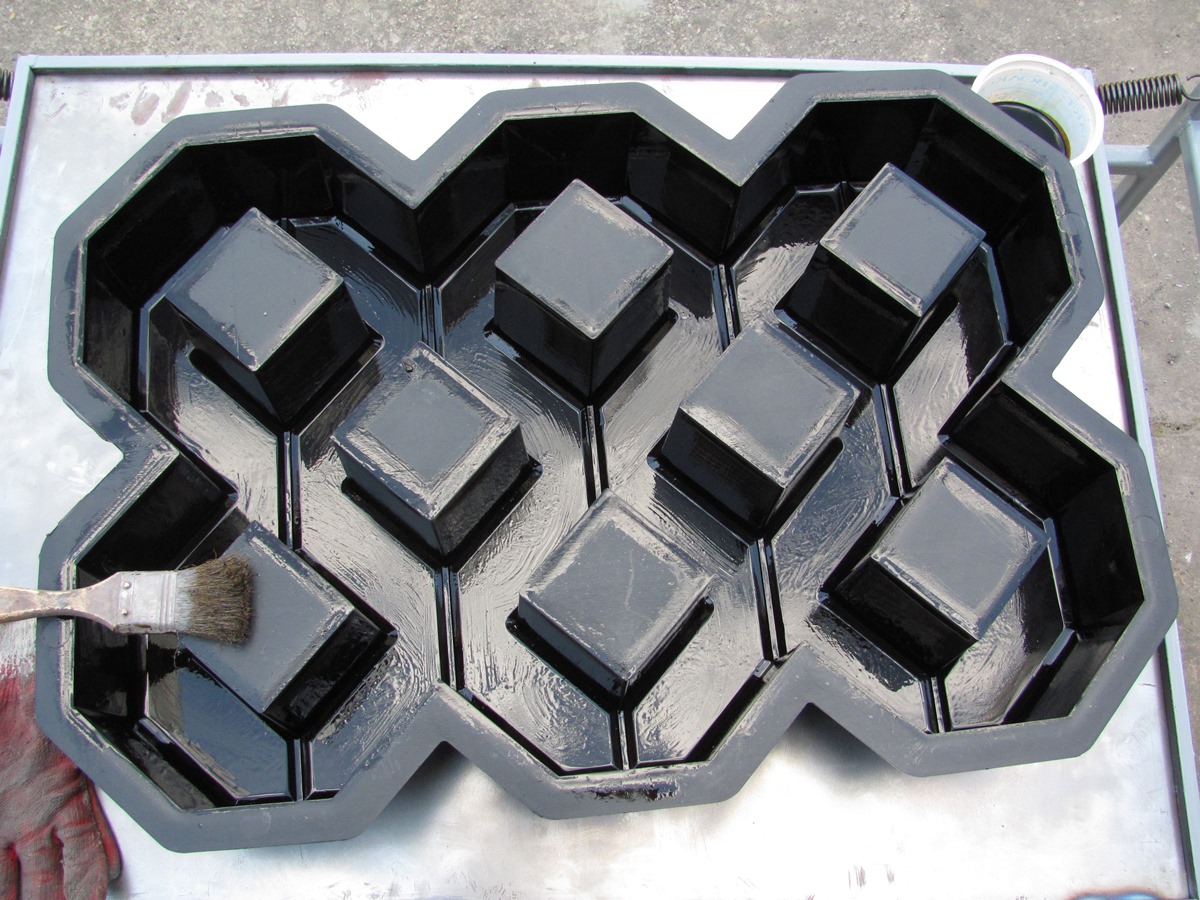 Смазываем стенки формы отработкой. Таким образом застывшей плитке проще выскользнуть при распалубке.