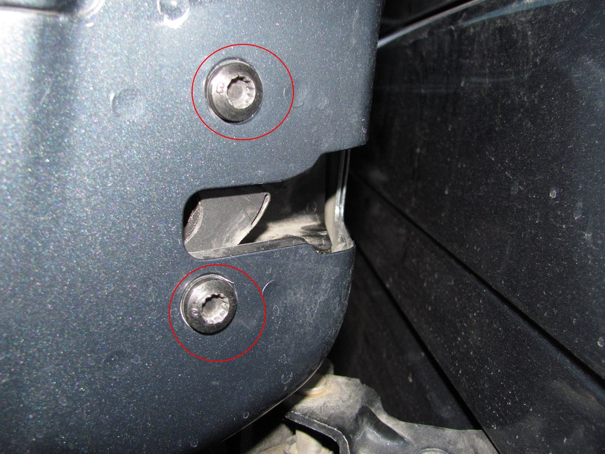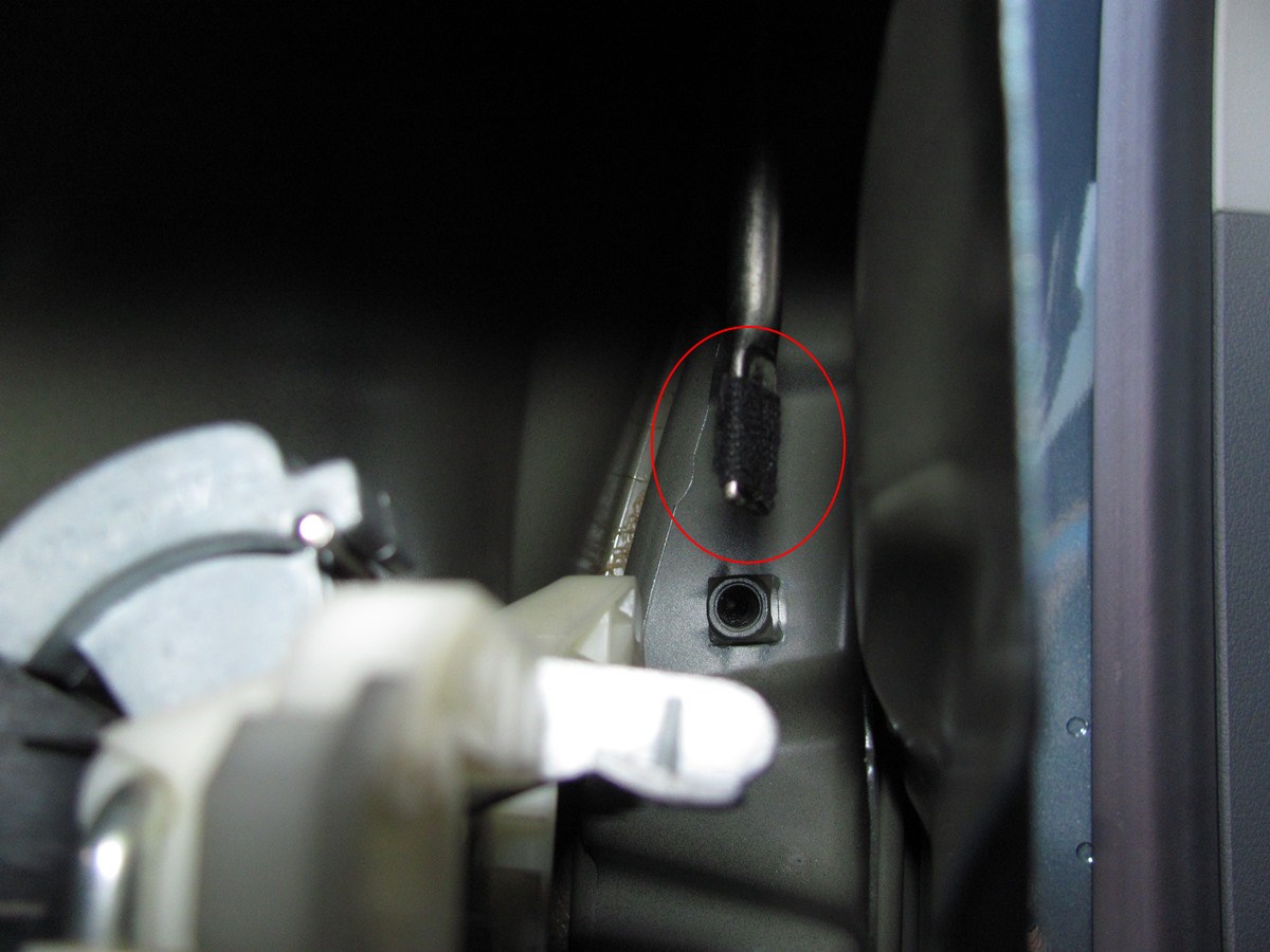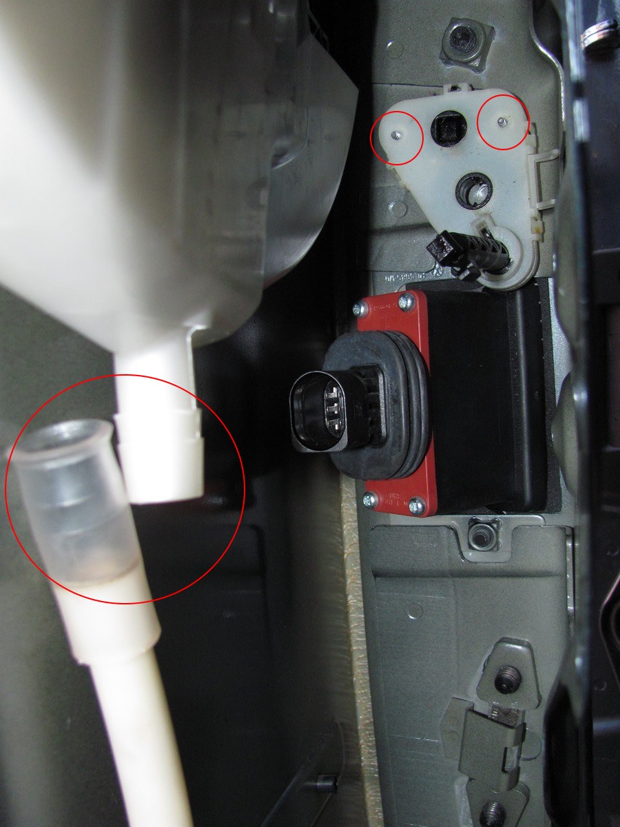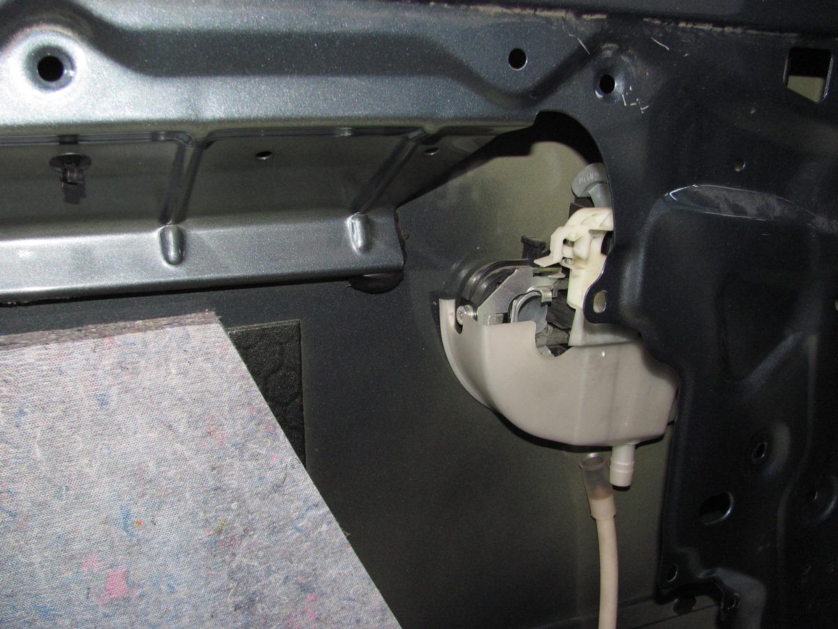 3) Отключаем штекер питания (тянем лепесток в сторону проводов - на себя), снимаем замок (откручиваем 3 винта) и замок-защелку (откручиваем 2 винта). Тросик между ними крепится ко внутренней верхней части двери зажимом 2K0843213. На первой фотографии показан установленный новый замок.