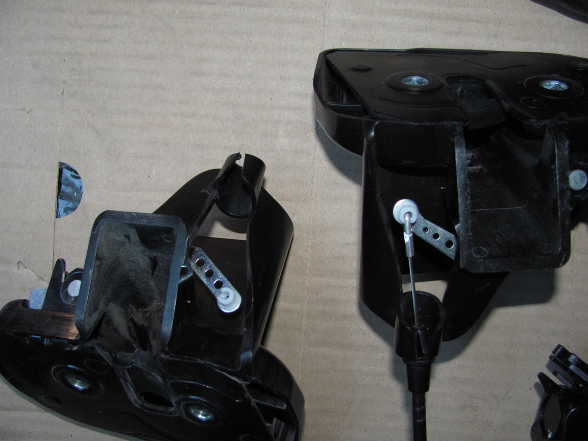 6) Крепление троса к замку-защелке. Новый замок шел в комплекте со своим замком-защелкой. Я оставил старый, для этого перекинул трос с одного на другой.