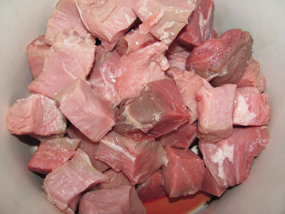 1) Режем кубиками свинину. В данном случае 1 кг с хвостиком.