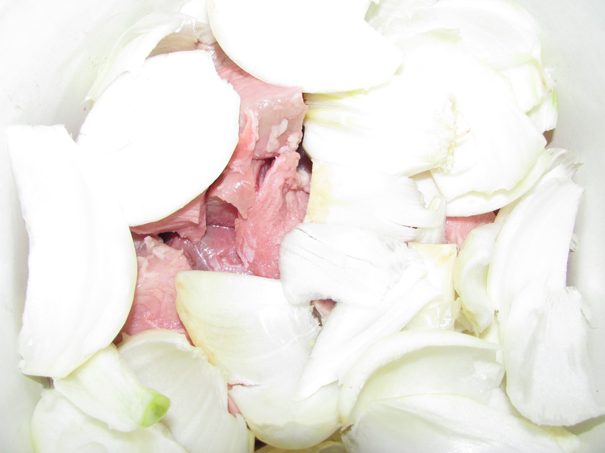 2) Разрезаем большую луковицу на 4 части и разбираем ее «по одежкам».