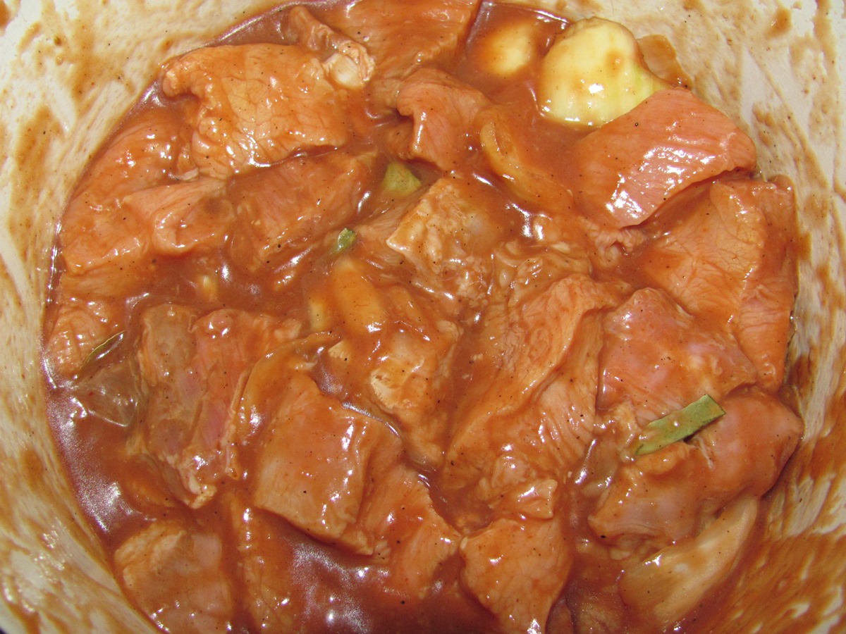 3) А здесь самое интересное – маринад. Оставалось 3/4 500-грамовой банки томатного соуса – вылил всю. Чеснока не оказалось, поэтому использовал сушеный чеснок в гранулах, приблизительно 0,5 чайной ложки. Вместо тимьяна и розмарина добавил 4 лавровых листочка. По рецепту нужен рассол из соленых огурцов, но нашлись только маринованные. Не беда, добавил полстакана Еще 2 столовые ложки подсолнечного масла, чайная ложка сахара, немного молотого черного перца.