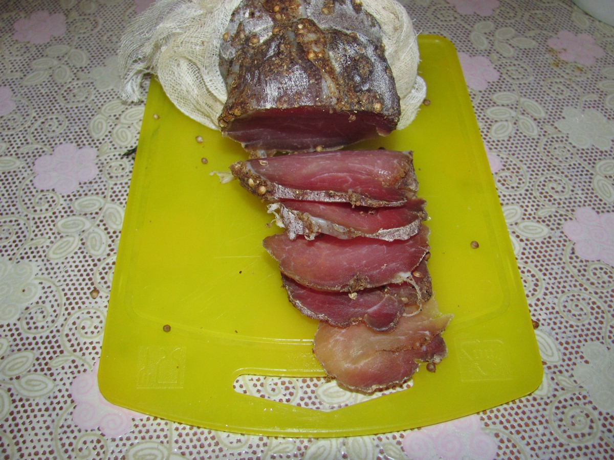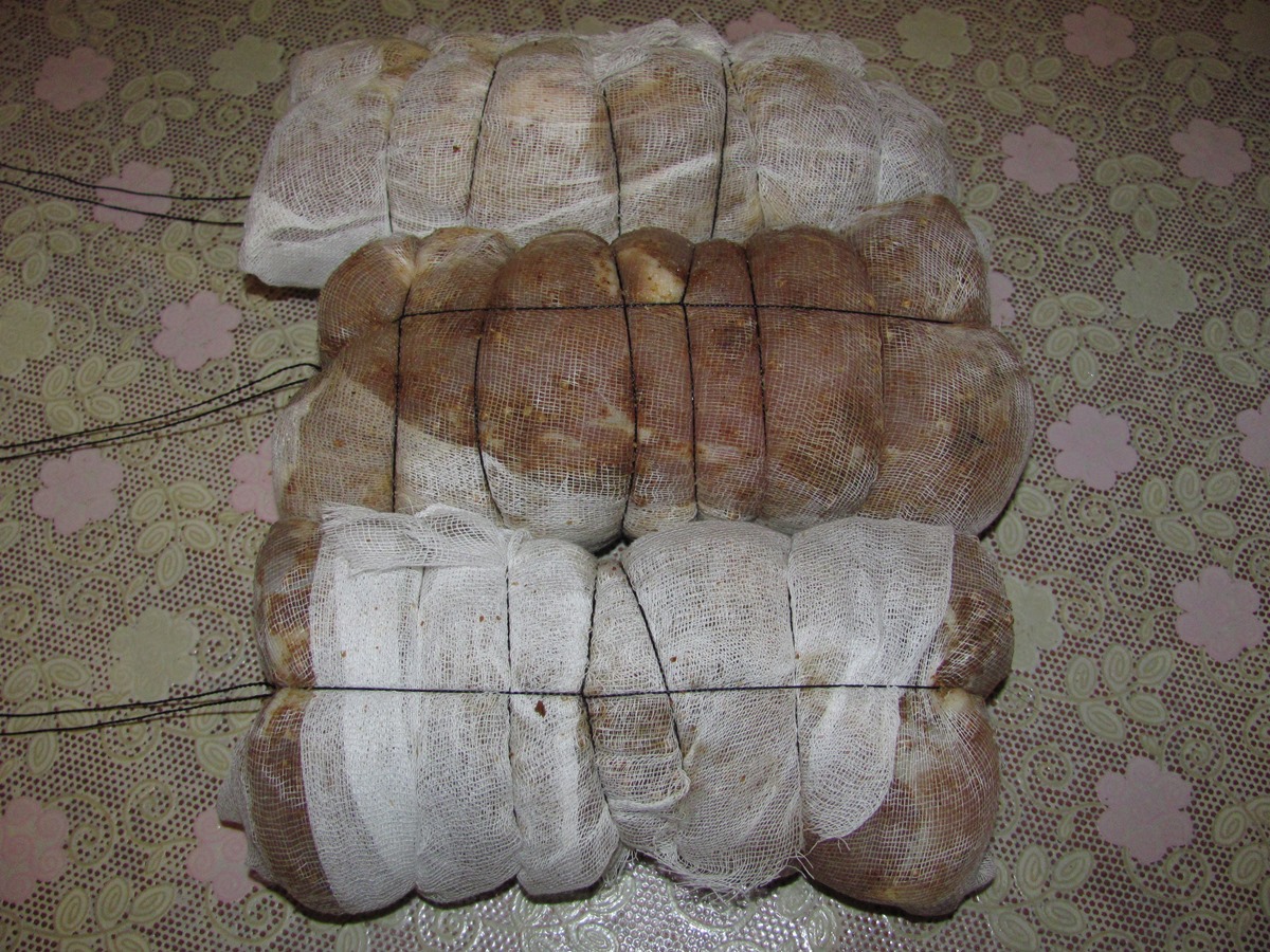 7) Заворачиваем в марлю, перевязываем бечевкой и подвешиваем сушиться на балконе или кладем в холодильник. По наблюдениям: подвешенное на трубу рядом с теплой батареей мясо вялится 5 дней до мягкого состояния, через 7 дней уже твердеет (на любителя). На балконе дольше, полторы-две недели в зависимости от температуры. В холодильнике ни разу не вялил.