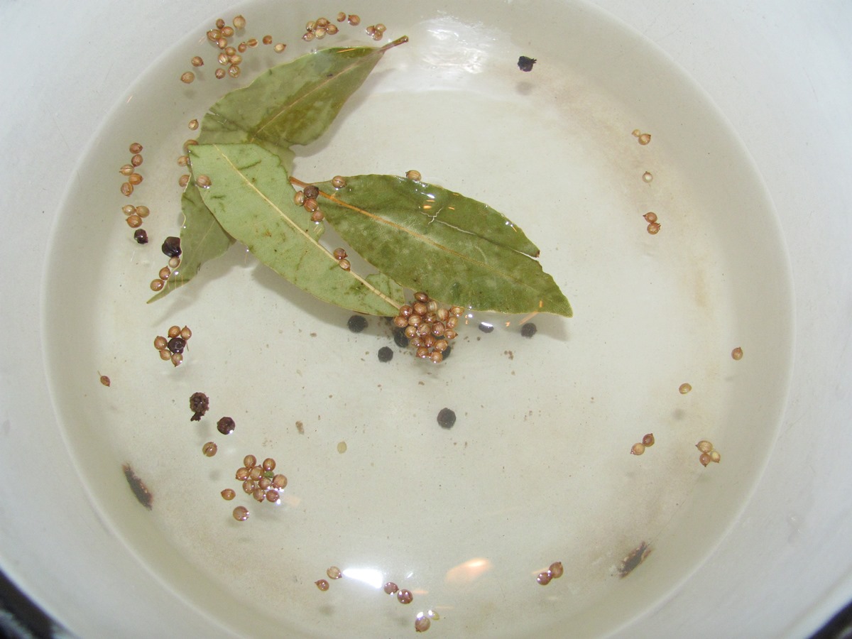 Далее приготавливаем рассол. Для этого кипятим воду. На 1 литр воды добавляем 1,5 столовых ложки соли, 3 столовых ложки сахара, 10 горошков черного перца, пол чайной ложки горошков кориандра, 3 лавровых листа. Размешиваем и даем рассолу остыть.