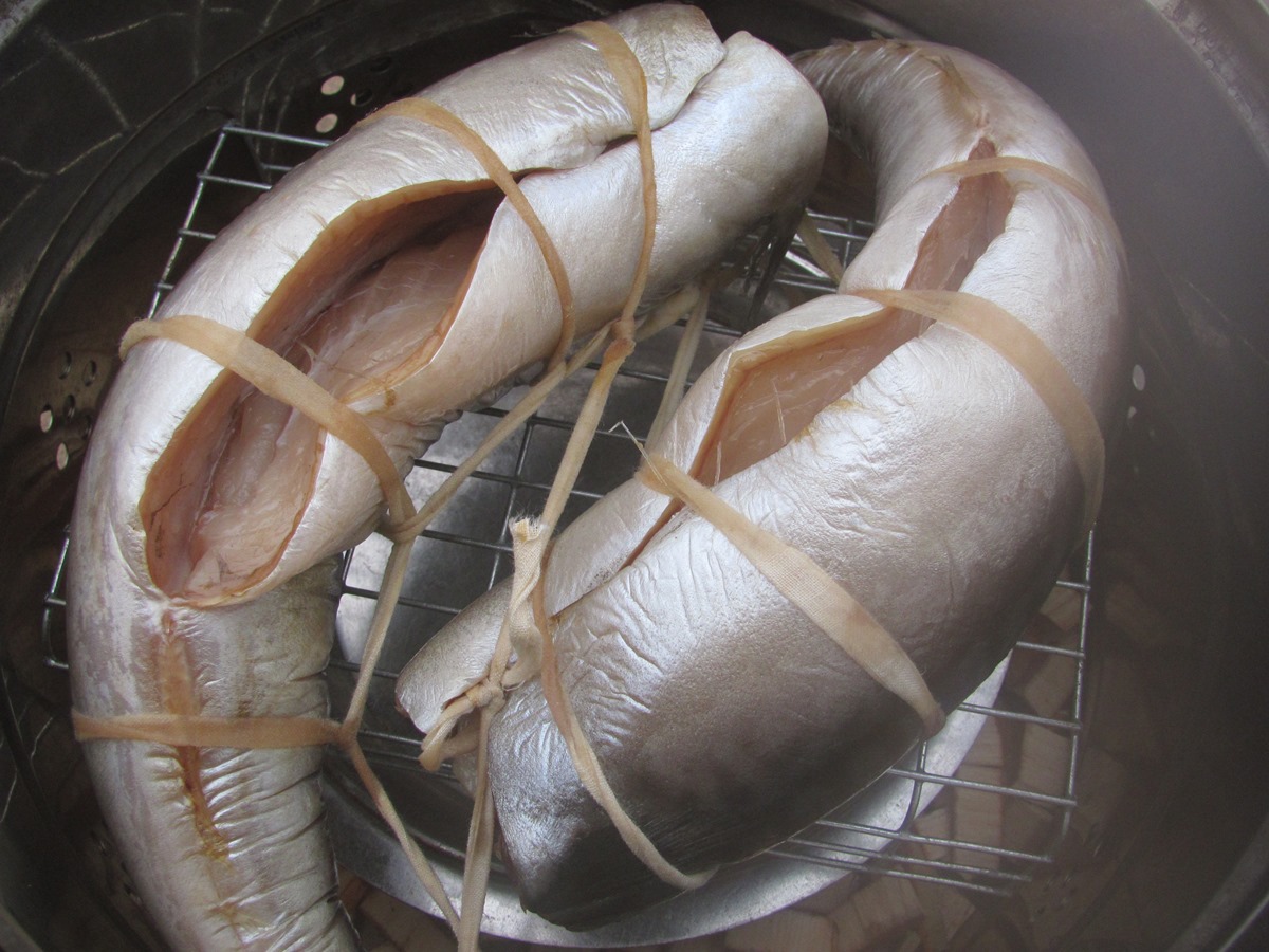 …и подвешиваем. Лишняя жидкость должна вытечь, а шкурка – подсохнуть, иначе в процессе копчения рыбка начнет вариться.