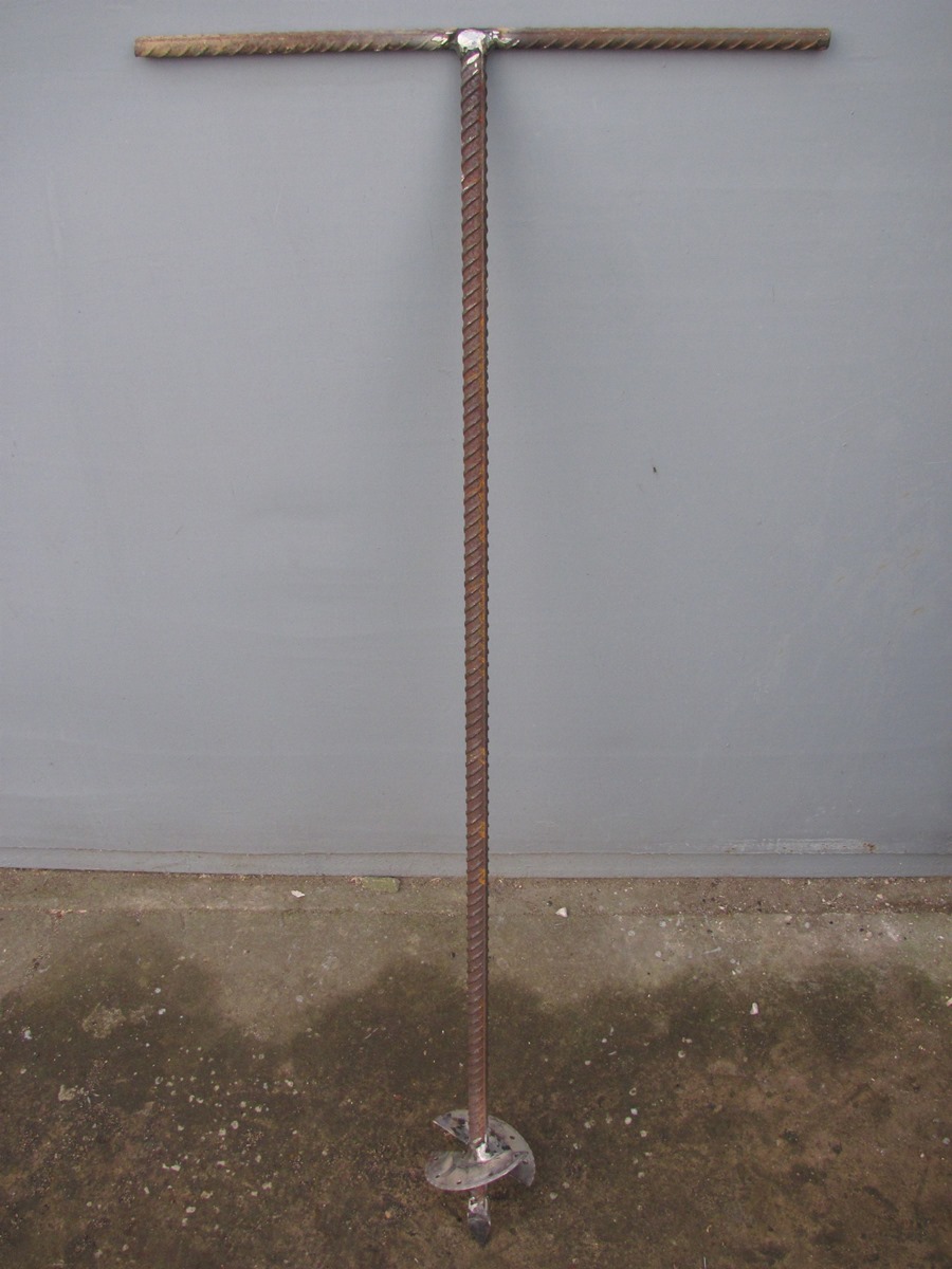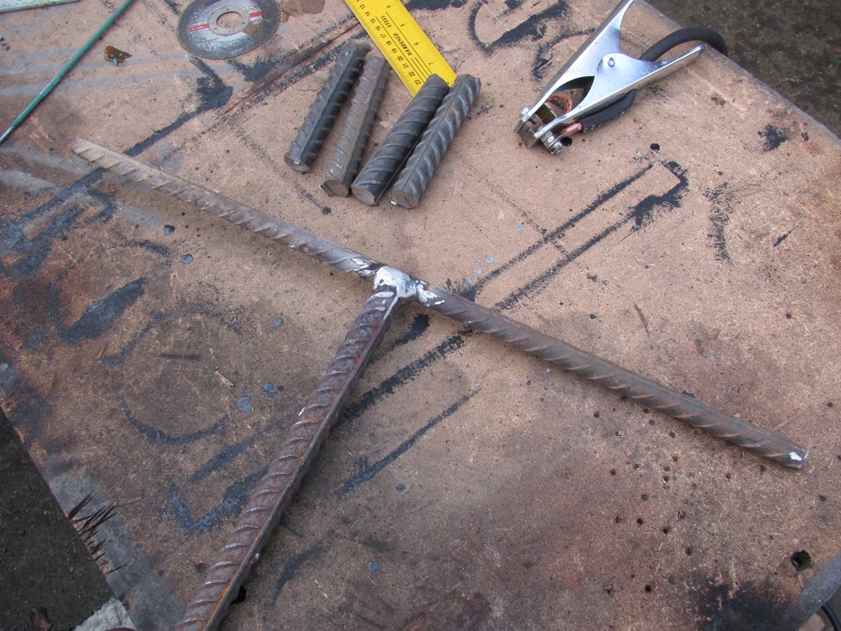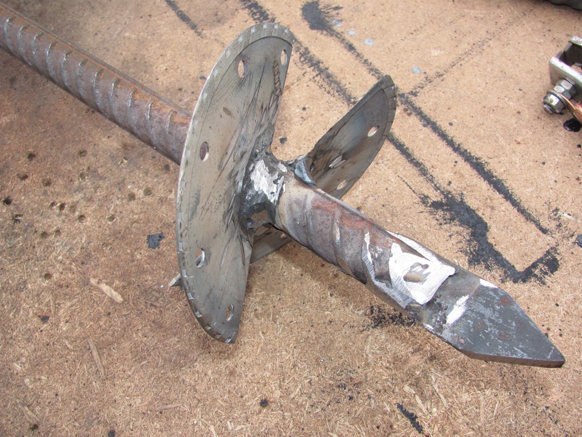 Разрезаем его на две части и привариваем крест-накрест к арматуре так, чтобы полученный винт врезался в землю по часовой стрелке. Привариваем острие. Затачиваем режущие грани.