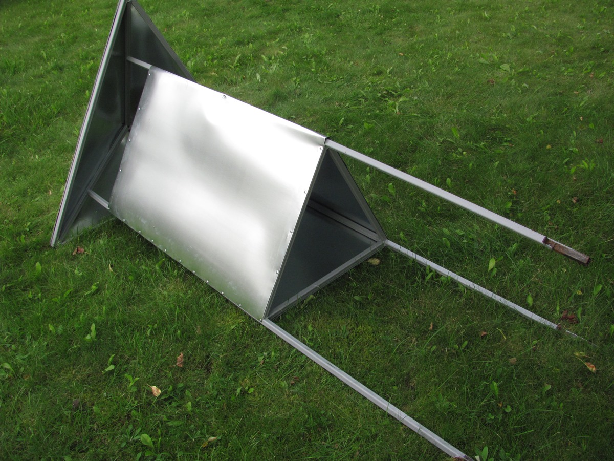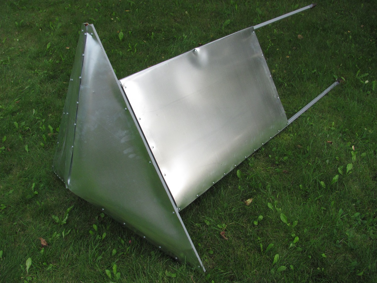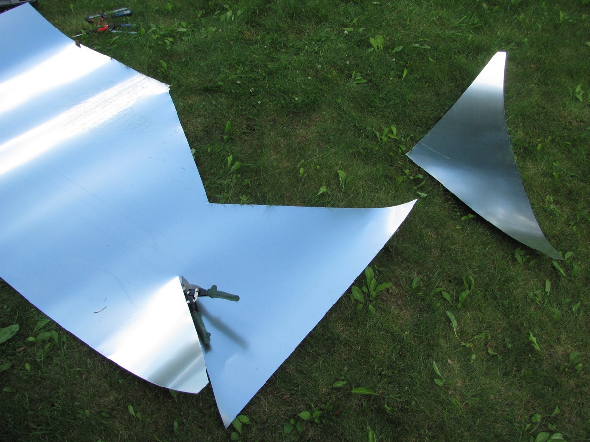Один лист оцинкованной стали размером 0,35×1000×2000 обогнут вокруг каркаса и прикручен оцинкованными саморезами, из второго вырезаны элементы кровли.