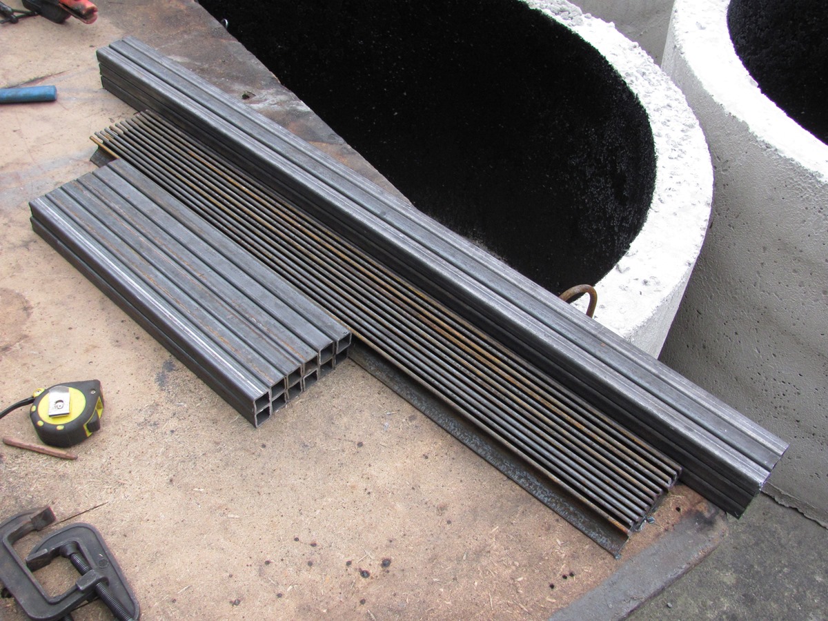 Профильную трубу 20×20×2 делим на 12 частей длиной 40 см и 9 частей длиной 1 метр. Также понадобилось 12 частей уголка 25×4 длиной 80 см каждая. Длины рассчитаны для шин 195(205)/65R15 и 185/65R14.