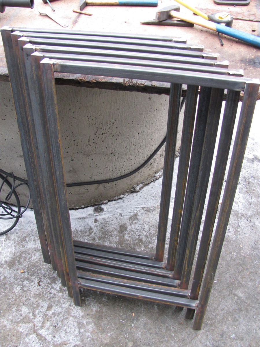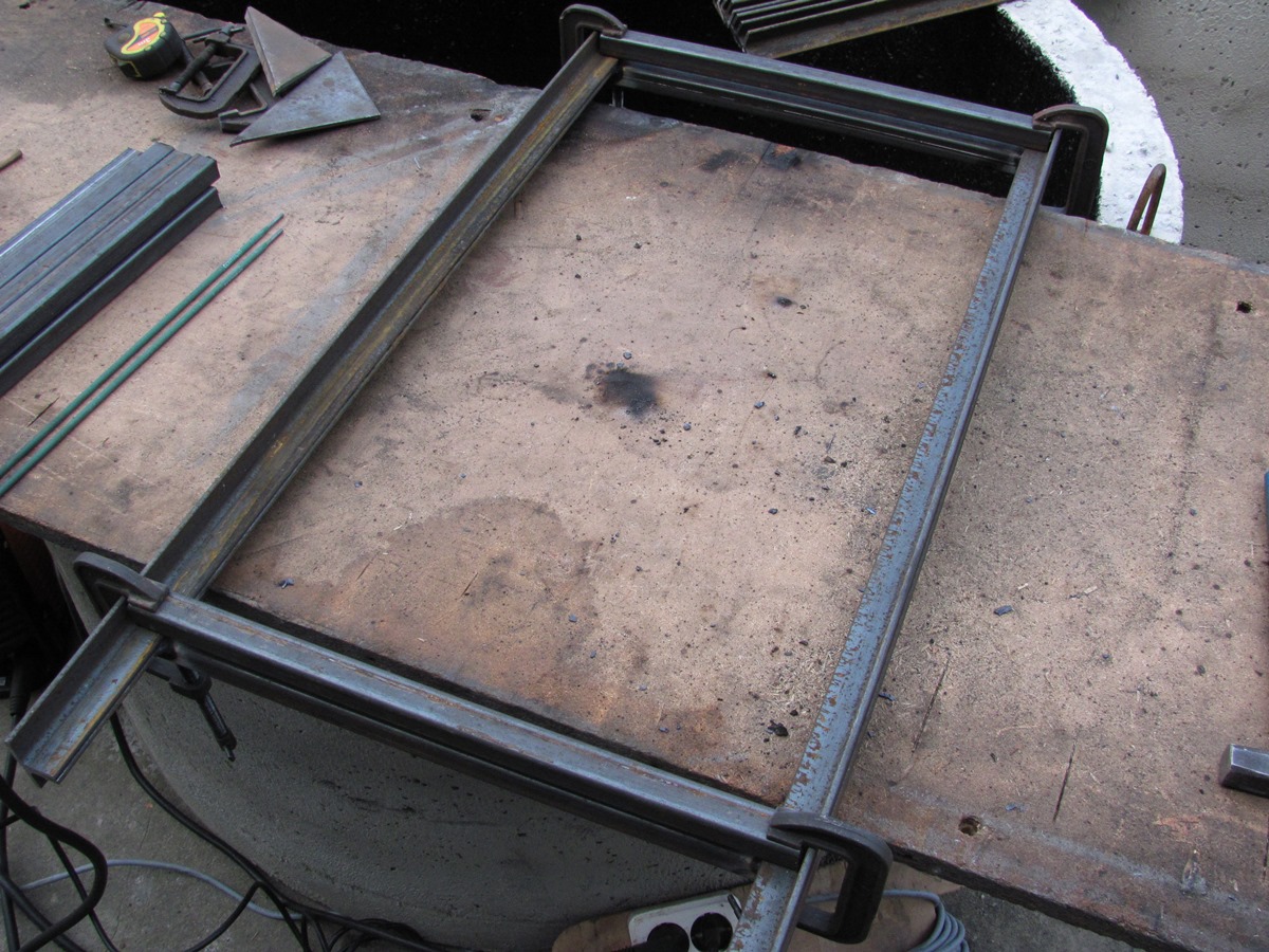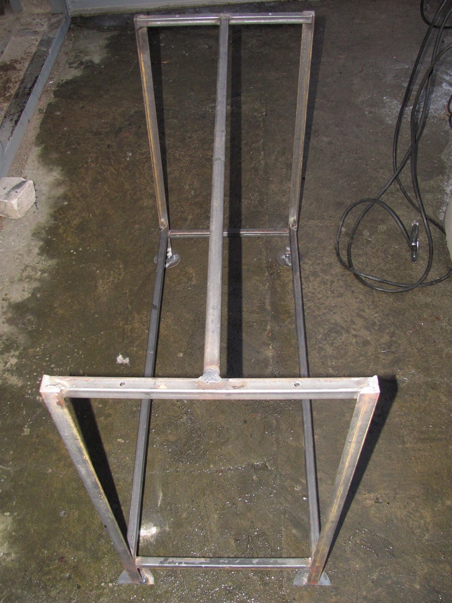 Привариваем горизонтальные перекладины. Верхняя короче двух нижних. Далее сверлим отверстия для столешницы.