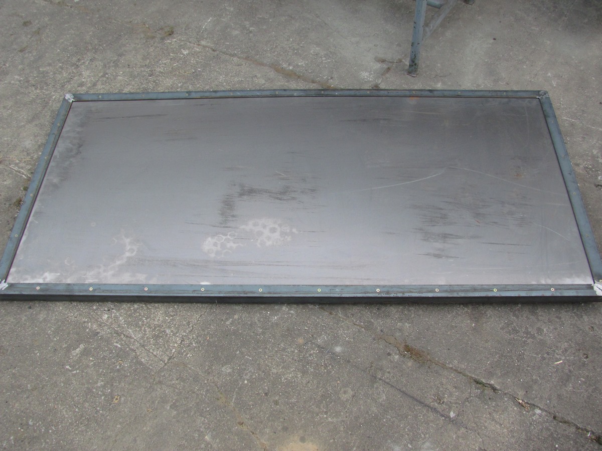 Далее из холоднокатаного листа толщиной 1 мм вырезаем покрытие столешницы и укладываем его между досками и уголком.
