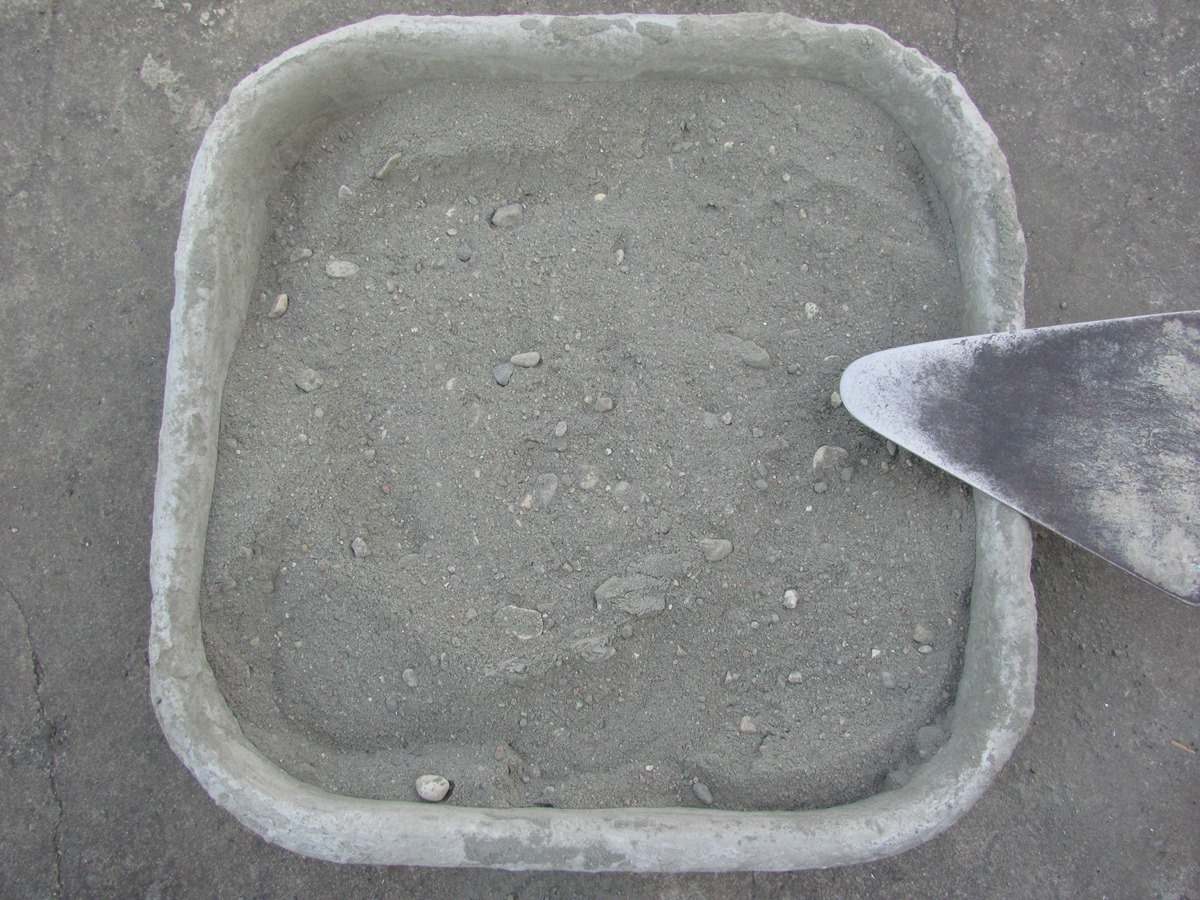 Смешиваем цемент с песком в соотношении 1 к 3. Для заливки одной формы достаточно десятилитрового оцинкованного ведра песка с горкой и треть ведра цемента.